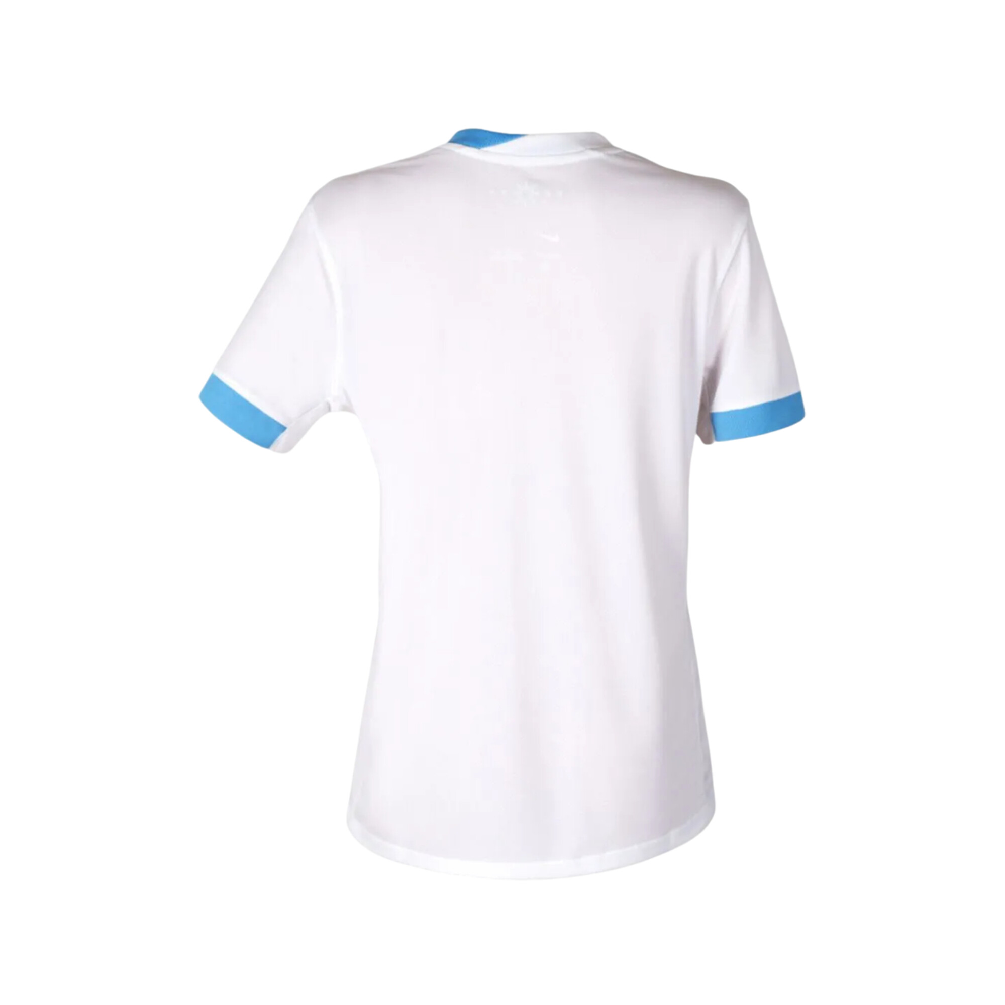 La camiseta visitante de Uruguay 2025 presenta un diseño blanco sobrio con detalles celestes en el cuello y mangas, reflejando la elegancia y el temple celeste más allá de nuestras fronteras.
